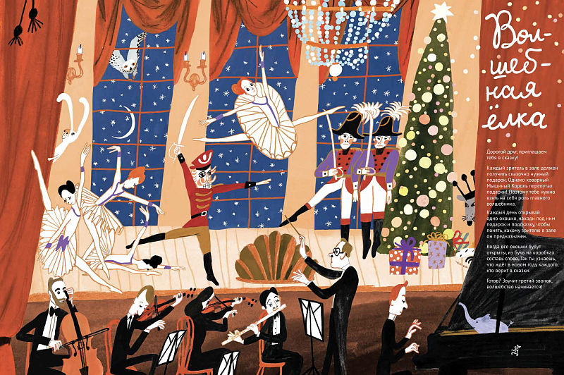 <p> Адвент-календарь перенесёт вас в театр, на сцене которого в самом разгаре самый волшебный балет — «Щелкунчик». </p> <p> Каждый зритель в зале должен получить сказочно нужный подарок. Однако коварный Мышиный Король перепутал подарки! Поэтому юному читателю предстоит взять на себя роль главного волшебника. </p> <p> Каждый день нужно открывать по одному  окошку, где спрятаны подарок и подсказка, чтобы понять, какому зрителю в зале он предназначен. И с каждым открытым окошком Новый год будет всё ближе, а волшебства — больше. </p> <h2>5 причин купить адвент-календарь «Волшебная ёлка»:</h2> <ul> <li> <p> Ожидание одного из самых любимых праздников в году станет интересным — ведь каждый день обладателя календаря будет ждать новое задание; </p> </li> <li> <p> Загадки в окошках будут интересны детям и взрослым;<br> </p> </li> <li> <p> Из части наклеек юный читатель сможет составить слово-предсказание;<br> </p> </li> <li> <p> О каждом персонаже календаря можно придумать свою историю, описать его характер и планы на праздник. Среди зрителей вы найдёте известных композиторов, слона, носорога, зайца и даже дракона! Семейный сторителлинг — штука полезная и очень весёлая!<br> </p> </li> <li>Новый год начнётся у вас уже 1 декабря!<br> </li> </ul>