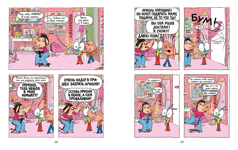 <p> «Ариоль» — это серия весёлых комиксов о повседневной жизни маленького ослика и его лучшего друга, непослушного, но очень симпатичного поросёнка. Они вместе ходят в школу, вместе ездят на каникулы, вместе играют и вместе валяют дурака. Их придумал Эмманюэль Гибер, один из наиболее авторитетных французских комиксистов, обладатель премии Рене Госинни за сценарное мастерство, а нарисовал известный детский иллюстратор Марк Бутаван. </p> <p> Мама, папа и Ариоль — дружная ослиная семья. На первый взгляд их всего трое, но давайте присмотримся повнимательнее! Если учесть, что мама любит папу, папа любит маму, мама любит Ариоля, папа любит Ариоля, а Ариоль любит маму и папу, то это ж сколько народу! </p>