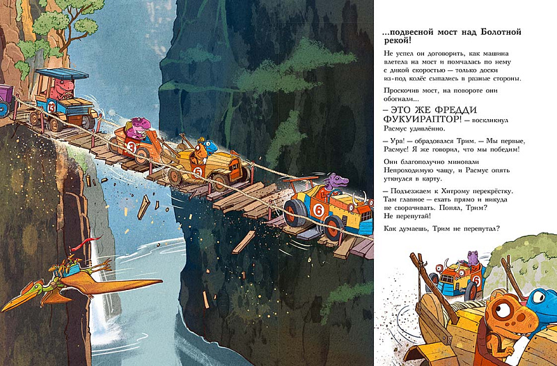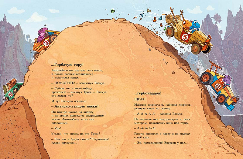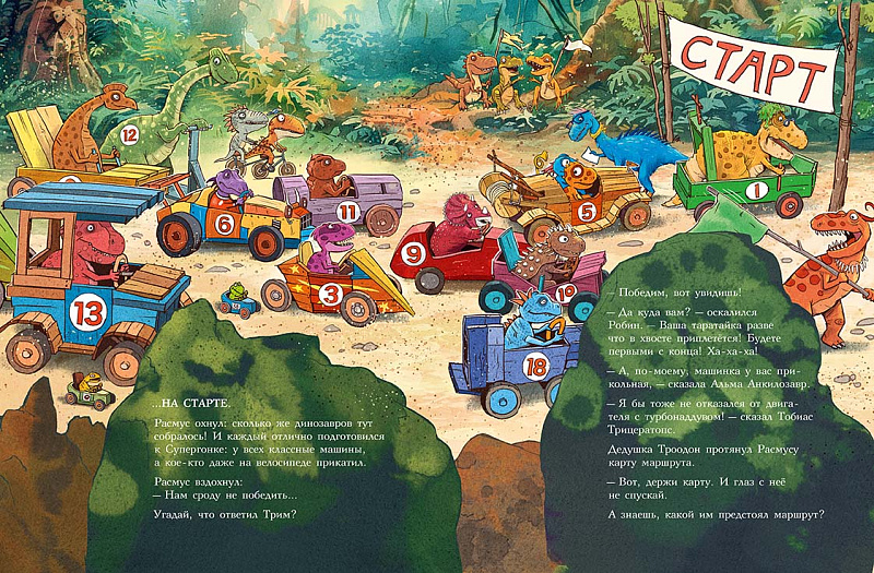 Каждая книга серии «Друзья-динозаврики» рассказывает об одном дне из жизни тираннозаврика Расмуса Рекса и его лучшего друга Трима Троодона. В тот день в Динозаврии стартовала Супергонка Болотного леса. Её устраивали в Динозаврии каждый год, но раньше Расмус и Трим в ней не участвовали — не на чем было. А в этом году у них появился автомобиль. Трим случайно наткнулся на него в тайной комнате механизмов и изобретений своего дедушки и уговорил деда подготовить автомобиль к Супергонке. Дедушка Троодон напридумывал кучу полезных приспособлений, и старая машина преобразилась — она стала быстрой, маневренной и безопасной. Впервые в жизни водителю Триму и штурману Расмусу предстояло пройти сложнейшую трассу. Несмотря на это, Трим был уверен, что они победят. Расмус, напротив, сильно сомневался, что они смогут преодолеть все препятствия и выиграть у Фредди Фукуираптора — супергонщика, который последние пять лет выходил победителем. Гонку друзья не выиграли, зато вывели обманщика и горе-чемпиона Фредди Фукуираптора на чистую воду.<br> <br> Серию о приключениях друзей-динозавриков сочинили и нарисовали писатель Ларс Мэле и художник Ларс Рудебьер. Вместе они создали целую страну Динозаврию, где на каждой странице ребёнка ждёт что-то смешное и неожиданное. В книге много диалогов, поэтому она отлично подойдёт для чтения вслух и разыгрывания по ролям с детьми от 4-х лет.<br> <br> Кроме увлекательного сюжета и симпатичных героев в книге есть небольшая познавательная часть. В ней рассказывается о том, какие динозавры были самыми быстрыми (без всякого автомобиля) и откуда учёные узнают, с какой скоростью бегали динозавры — ведь все они давным-давно вымерли!<br>