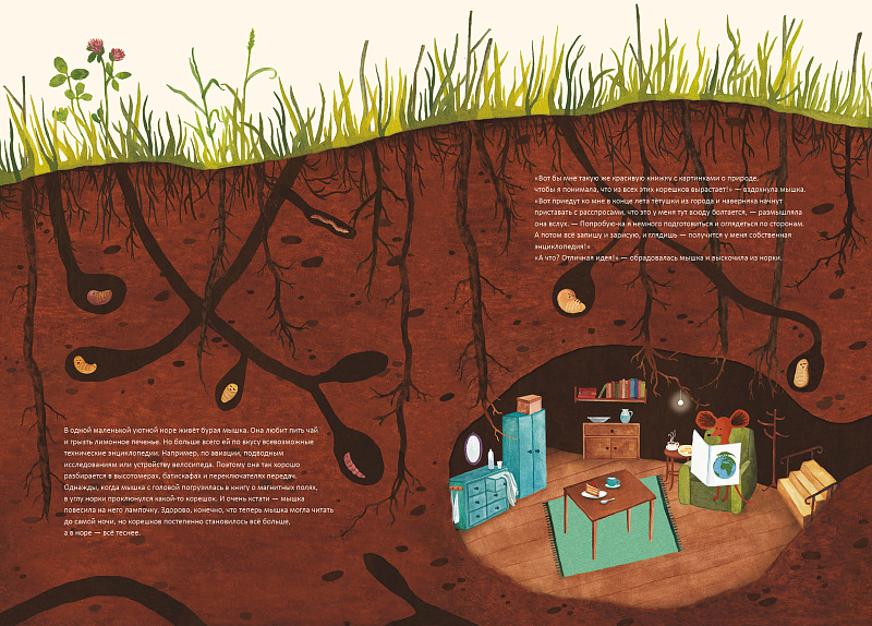 <br> В маленькой уютной норе в лесу живёт Мышка. Больше всего на свете она любит энциклопедии. И вот однажды в голову ей приходит прекрасная идея: а почему бы не составить собственную энциклопедию о таком большом мире, который окружает уютную нору,— и о всей мелюзге, которая в нём живёт!<br> <br> Отправляйся в путешествие по большому и маленькому миру вместе с Мышкой: изучи подземных жителей, собери гербарий, попробуй приманить насекомых на кусочек сырого мяса, загляни внутрь муравейника, научись различать трели птиц, ловить головастиков и выращивать петрушку.<br> <br> С этой энциклопедией можно ходить гулять! В лес, на озеро—да хоть по бабушкиному огороду. А если ты сидишь дома — из-за карантина или плохой погоды, — то погулять с Мышкой и её энциклопедией можно в приложении для планшета или компьютера. <br> <br> Мышка появилась не просто так, а в помощь ученикам младшей школы, изучающим природоведение. <br> <br> На русском языке книга вышла при поддержке Министерства культуры Чешской Республики.<br> <br> Мышку и её энциклопедию можно найти и как приложение для компьютеров и планшетов на сайте <a href="https://littlemousesencyclopedia.circusatos.com/"><u><span style="color: #000000;">littlemousesencyclopedia.circusatos.com</span></u></a>.<br> <br> А главное, с этой энциклопедией можно ходить гулять!<br> <br> <p style="text-align: right;"> </p> <p style="text-align: right;"> <i>«</i><i style="color: #333333;">"Энциклопедия мышки" — чудесная книга для дошкольников и младших школьников о природе вокруг нас. Об обитателях леса, водоёма, сада и огорода вам расскажет главная героиня книги — маленькая мышка. Она научит делать гербарий, наблюдать за насекомыми, поможет соорудить грядку на подоконнике. Расскажет просто и не скучно о пчелах муравьях, цепях питания.</i> <i><span style="color: #333333;">Книгу можно взять с собой в лес, парк, на пруд, в сад и огород — и вам с детьми там точно не станет скучно! А чтобы эта энциклопедия всегда была под рукой, её в виде приложения для планшета или смартфона можно скачать на официальном сайте</span><span style="color: #333333;">.</span>»</i> </p> <p style="text-align: right;"> </p> <p style="text-align: right;"> <b>Антипова Елена Анатольевна,<br> научный сотрудник Государственного Биологического музея им. К.А. Тимиряева</b> </p> <p> </p>