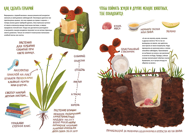 Отправляйся в путешествие по большому и маленькому миру вместе с Мышкой: изучи подземных жителей, собери гербарий, попробуй приманить насекомых на кусочек сырого мяса, загляни внутрь муравейника, научись различать трели птиц, ловить головастиков и выращивать петрушку.