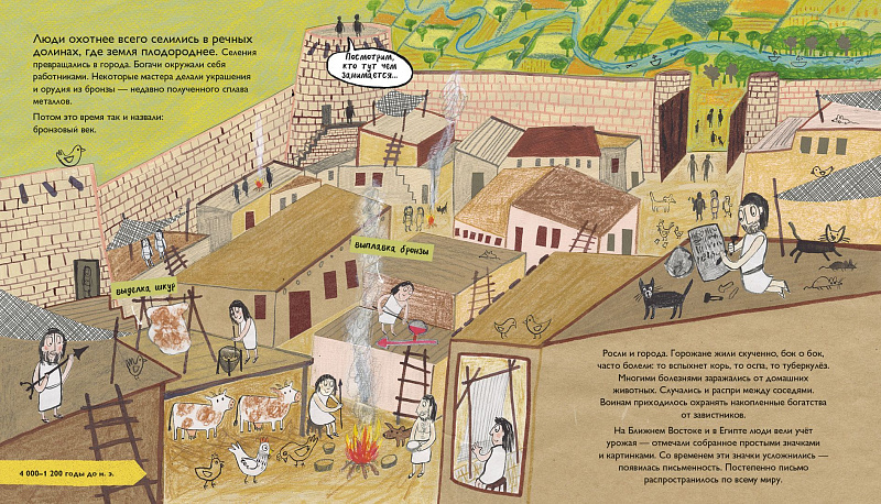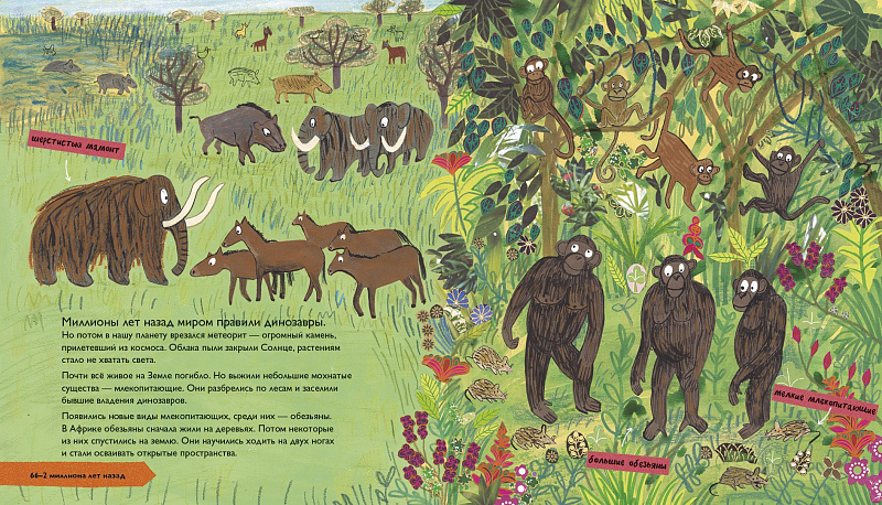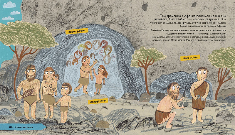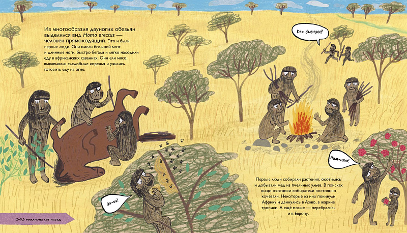 Учёные и педагоги Кэтрин Барр и Стив Уильямс объясняют историю эволюции человека понятно даже дошкольнику и при этом в соответствии с современными научными представлениями. А иллюстратор Эйми Хасбанд рисует доисторических людей и их предков и потомков с иронией и нежностью.