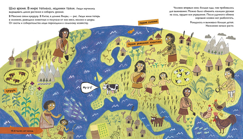 Название книжки как нельзя более точно описывает ее содержание: это не история планеты и не история зарождения жизни на ней, а история человека от того момента, как ученые перестали считать этот вид животным и причислили его к Homo, до наших дней. Два миллиона лет человеческой истории от приручения огня, палки-копалки, перехода к оседлости и земледелию до полетов в космос, мобильных телефонов и искусственного интеллекта у авторов уместилось в какие-то полтора десятка разворотов книжки-картинки. Зато очень показательно и наглядно.
