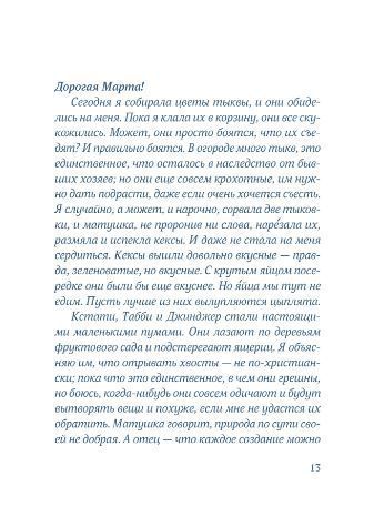 Мэй еще ребенок, но она уже знает, каково это, когда все в твоей жизни вдруг поменялось. Ее семья переезжает из городка Конкорд в Рай — место, где родители Мэй хотят построить идеальную коммуну. Там не едят мяса, не эксплуатируют животных (даже пчел!) и носят самую простую одежду из льна. И хотя в новой жизни есть место и дружбе — с индейской девочкой по имени Две Луны, и первой влюбленности — в Прекрасного Господина, и приключениям, но все-таки эту новую жизнь Мэй не выбирала. И единственный способ принять перемены — это взять в руки бумагу и перо и воссоздать реальность вокруг себя — в письмах подруге Марте, оставшейся в городе. У Мэй невероятное воображение, и в своих письмах она будто живет в разных реальностях, переосмысливает свое прошлое и придумывает будущие, еще не испытанные приключения. И понимает, что, как и в природе, в жизни все меняется, и движение является неотъемлемой частью жизни.