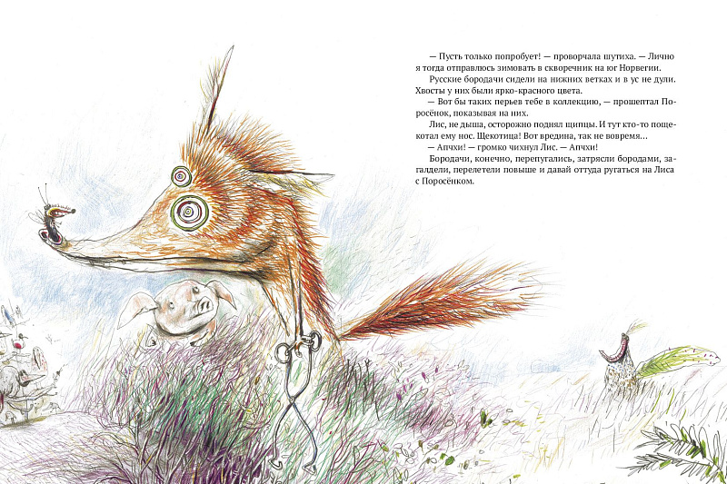 Во второй книжке наши давние знакомые — Лис и Поросёнок снова нашли приключения себе на голову (и на хвост). На этот раз друзья надумали открыть кафе для перелётных птиц. Блюда там на любой вкус: мясные мухи под соусом и отборные червяки, суп из личинок и живой десерт прямиком из муравейника. Вот только расплачиваться за угощение птицам придётся очень необычным способом.