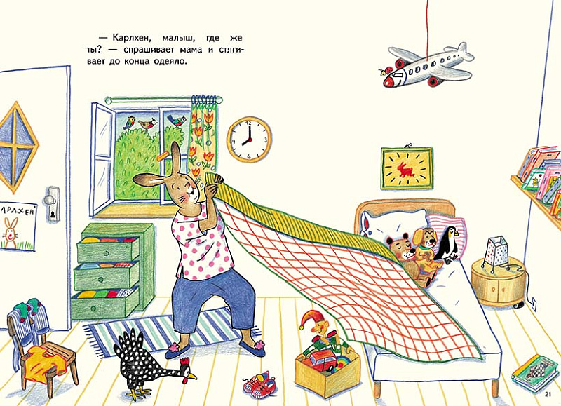 «Карлхен, папа, мама и бабушка Никкель» – сборник из пяти добрых семейных историй. Маленький зайчик по имени Карлхен живёт так же, как и все дети. Он начинает свой день с маминой улыбки, а по вечерам не очень любит укладываться спать. По субботам он ходит с папой в магазин, а летом приезжает в гости к бабушке в деревню. У Карлхена есть младшая сестрёнка Клара, есть кузина Кэти, есть любимые игрушки и друзья.<br> <br> Мир Карлхена понятен и близок всем маленьким детям, поэтому они сразу узнают себя в главном герое. Взрослые тоже с улыбкой взглянут на себя со стороны, разглядывая вместе с детьми картинки и читая простые диалоги. Кроме того, мамы и папы найдут в книге бесценные идеи и подсказки, как лучше общаться с малышом, как превращать ежедневную рутину в увлекательную игру и становиться ближе друг другу.<br> <br> Ротраут Сюзанне Бернер – немецкая художница с мировым именем. В 2016 году она была удостоена самой престижной награды в области детской литературы – Премии имени Ханса Кристина Андерсена. Её уникальные иллюстрации подкупают своей простотой, вниманием к мельчайшим деталям и глубоким пониманием мира ребёнка. Серия книг о зайчонке Карлхене – одна из самых знаменитых её работ.<br> <br> <b>Рассказы в сборнике:</b><br> <ul> <li>С добрым утром, Карлхен!</li> <li> Где Карлхен?</li> <li> Карлхен отправляется за покупками</li> <li> Сюрприз для Карлхена</li> <li> Спокойной ночи, Карлхен!</li> </ul>