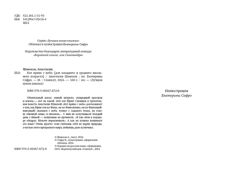 <p> Обаятельный нахал, умный хитрюга, зловредный красавец и наглец — вот он какой, этот кот Ефим! Смешная и трогательная повесть Анастасии Шанской «Кот прямо с неба» рассказывает о том, как Ефим (он же Фима, он же Фимозятина, он Фимозный-навозный) свалился с неба, точнее с седьмого этажа, на голову обычной семье, и началось… С ним не соскучишься! Каждый день с Фимой — испытание на прочность. «Я там обои в коридоре ободрал. Можете переклеивать». А как же хозяева понимают его язык? Очень просто: если считаешь себя не царём природы, а частью этого прекрасного мира, поймёшь даже кузнечика. </p> <h2>5 причин купить книгу «Кот прямо с неба»:</h2> <ul> <li> <p> Забавная история-дневник о том, как в одну непростую семейку попал кот с ещё более непростым характером; </p> </li> <li> <p> Книга подскажет, что делать, если нашёл на улице животное, и как с ним справляться; </p> </li> <li> <p> Для чтения детям, взрослым, вслух, про себя, для себя и для других; </p> </li> <li> <p> Книга о любви всех ко всем и ко всему! К хвостатым и бесхвостым, к животным и птицам, к рассаде перцев, к ночному тыгыдыму и, конечно, к огурчикам; </p> </li> <li> <p> Иллюстрации Екатерины Сафро — отдельная радость и удовольствие. </p> </li> </ul> <p> <b>ЦИТАТЫ ИЗ КНИГИ:</b> </p> <p> <i>«Кот попытался привстать, но не смог: с задней лапой что-то было не так. Я вздохнула: </i> </p> <i> </i> <p> <i> — Пойдём, что ли, ко мне? </i> </p> <i> </i> <p> <i> Кот присмотрелся оценивающе и спросил: </i> </p> <i> </i> <p> <i> — А где ты живёшь? </i> </p> <i> </i> <p> <i> — В соседнем доме. </i> </p> <i> </i> <p> <i> — Этаж? </i> </p> <i> </i> <p> <i> — Шестой. </i> </p> <i> </i> <p> <i> — Одна? </i> </p> <i> </i> <p> <i> — Нет. Муж у меня. И дети. Паша и Варя. </i> </p> <i> </i> <p> <i> — И всё? </i> </p> <i> </i> <p> <i> — Ну, кошка ещё… </i> </p> <i> </i> <p> <i> — Одна? </i> </p> <i> </i> <p> <i> — Две… Кошка Бася — толстенькая и беленькая. Кошка Шнурок — чёрненькая и вечно спящая. </i> </p> <i> </i> <p> <i> — И всё? </i> </p> <i> </i> <p> <i> — Ну, собака ещё… Рони… </i> </p> <i> </i> <p> <i> — Да у тебя там дурдом. Породистая хоть собака? </i> </p> <i> </i> <p> <i> — Не-а… </i> </p> <i> </i> <p> <i> Кот закатил глаза: </i> </p> <i> </i> <p> <i> — Знаешь, я, наверное, хозяина подожду. Он скоро придёт за мной. Всё-таки я бенгал. Наполовину».</i> </p> <p> <i>«Сегодня Фимозный совершил важное открытие: он может быть частью колокола. </i> </p> <i> </i> <p> <i> Как он это узнал? Засунул голову в графин с водой и, почувствовав себя язычком колокола, давай дубасить графином по стенам — звон стоял упоительный, пока не закончился благовестом: графин рухнул на пол. </i> </p> <i> </i> <p> <i> Я прибежала на кухню — весь пол залит. </i> </p> <i> </i> <p> <i> — Воды-то сколько, — сказал Фима. — Давай убирай, пока я лапки не замочил. </i> </p> <i> </i> <p> <i> — Я вот сейчас тобой всё это и подотру, — рыкнула я. </i> </p> <i> </i> <p> <i> — Но-но, — сказал Фима. — Поговори мне. </i> </p> <i> </i> <p> <i> И залез под диван».</i> </p> <p> <i>«— Ну вот не стыдно ли? Я вам столько хорошего сделал, а тут попрёки. </i> </p> <i> </i> <p> <i> — Что ты сделал, например? </i> </p> <i> </i> <p> <i> — Например, я научил вас смирению».</i> </p>