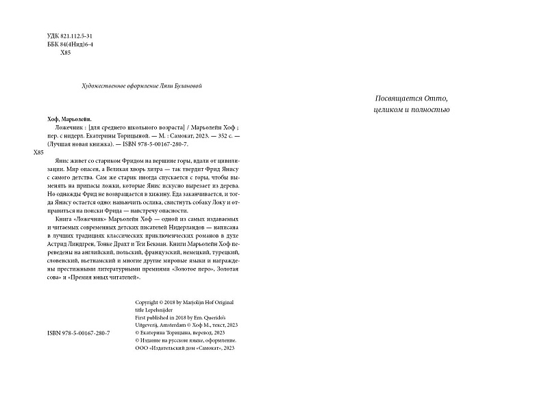 Книга «Ложечник» Марьолейн Хоф — одной из самых издаваемых и читаемых современных детских писателей Нидерландов — написана в лучших традициях классических приключенческих романов в духе Астрид Линдгрен, Тонке Драхт и Теи Бекман.