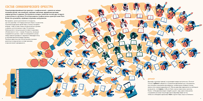 Как устроен оркестр и на какие группы делятся музыкальные инструменты? Что значит «читать ноты» и как сочиняют музыку? Из чего состоят скрипка, труба и кларнет? Чем орган отличается от пианино? Почему так важна акустика концертного зала?
