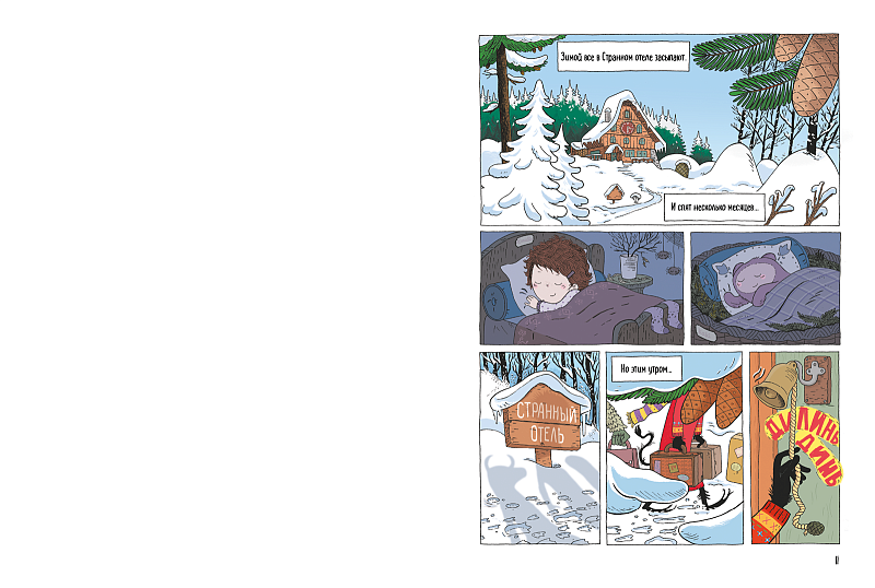 Странный отель — это обычный отель, только… немного странный. Управляют им бесстрашная девочка Мариэтта и симпатичные загадочные существа: безумный философ месье Леклер, привидение месье Снарф и маленький беспокойный монстр по имени Кики. А на страницах книги встречаются тревожники, кровососы, ворчуны и Большой Бурч. Мариэтте и компании нужно разыскать куда-то запропастившегося дядюшку Весну, потому что иначе зима не закончится, и она отправляется на поиски огромного сапфира, который был похищен у разбойников.