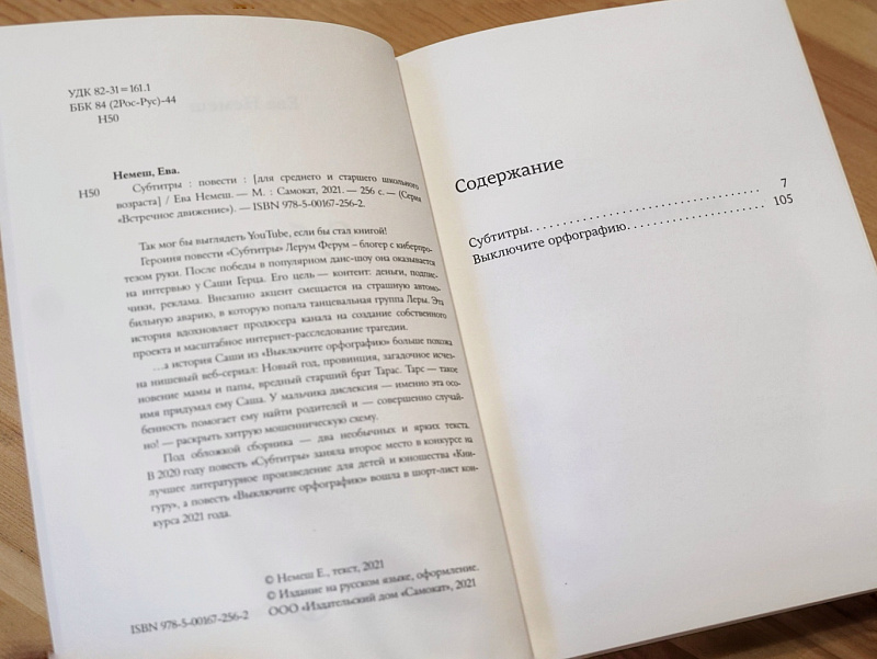 Под обложкой сборника — два необычных и ярких текста. В 2020 году повесть «Субтитры» заняла второе место в конкурсе на лучшее литературное произведение для детей и юношества «Книгуру», а повесть «Выключите орфографию» вошла в шорт-лист конкурса 2021 года.