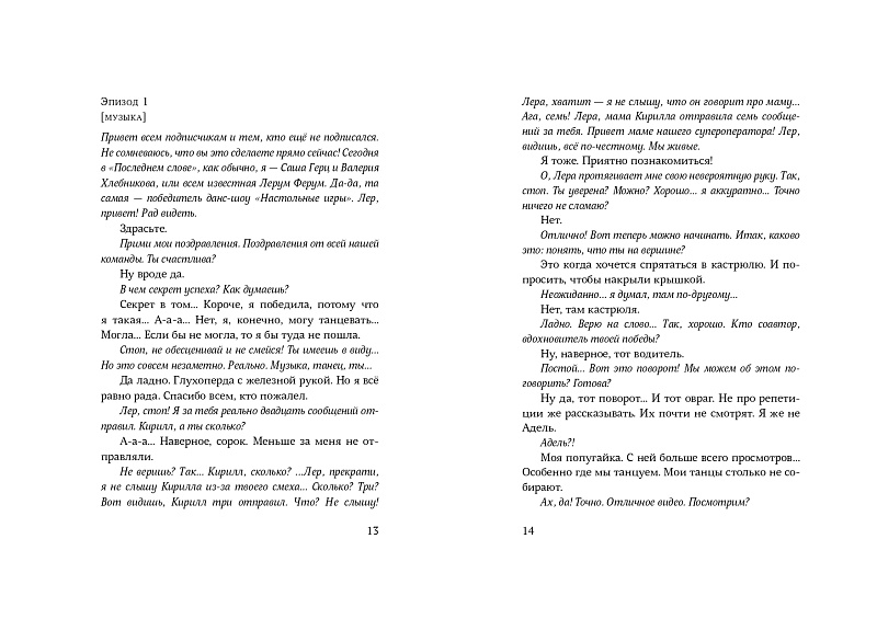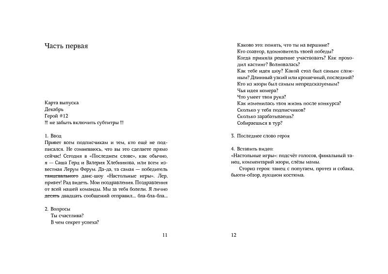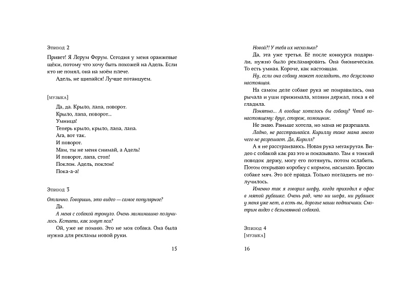 Героиня повести «Субтитры» Лерум Ферум – блогер с киберпротезом руки. После победы в популярном данс-шоу она оказывается на интервью у Саши Герца. Его цель контент: деньги, подписчики, реклама. Внезапно акцент смещается на страшную автомобильную аварию, в которую попала танцевальная группа Леры. Эта история вдохновляет продюсера канала на создание собственного проекта и масштабное интернет-расследование трагедии.