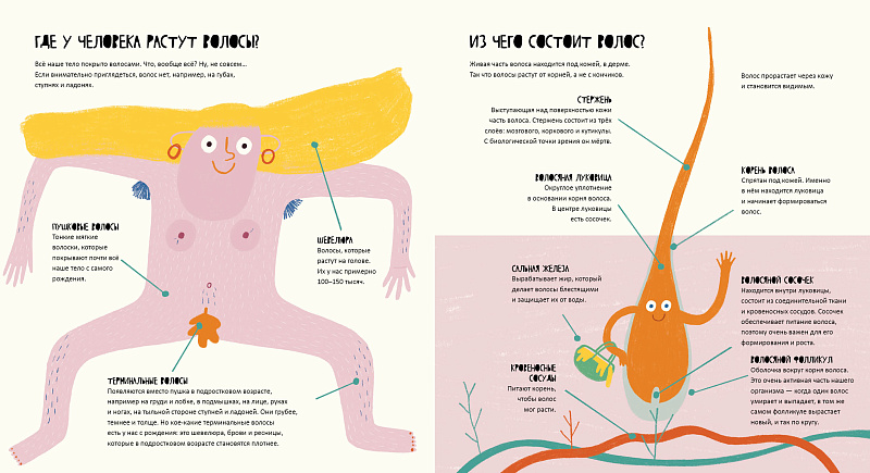 • Волосы растут не только на голове, а практически по всему телу. Поэтому сначала внимательно изучаем книжку, а потом — себя!