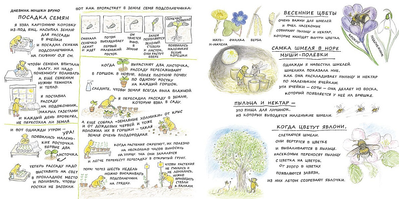 Главную историю книги «обрамляют» записки из дневника наблюдений мишки Бруно, которые вынесены в начало и в конец книги. В них содержится множество зарисовок и познавательных сведений из мира окружающей природы определенного времени года. Первый дневниковый разворот посвящен птицам: кто как выглядит и как поет, из чего вьют гнезда и как выводят птенцов. Второй – подробно рассказывает о том, как посадить рассаду, как прорастает в земле семечко, как выглядят первые подснежники.